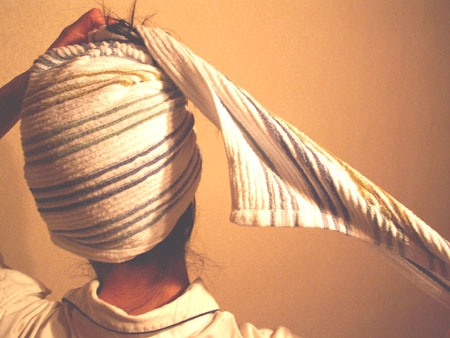 他にも左右から挟み込む巻き方や、前頭部で結ぶ巻き方など、タオルを購入した際についてくる帯にパターンが載っています。ちなみに私が実践してみたのはパターンB。この巻き方はストレッチタオルならでは。