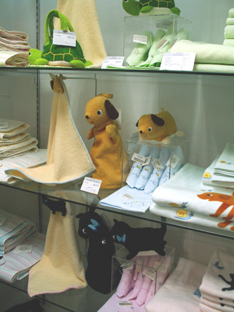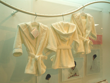 もう、どれもホントに小さくてかわいくて、胸キュン。中でも目を引いたのがバスローブ。無地のものからキャラクターものまで、素材もタオルからワッフル、ガーゼまで種類豊富。実際、出産祝いに選ぶ人が増えているそうです。
