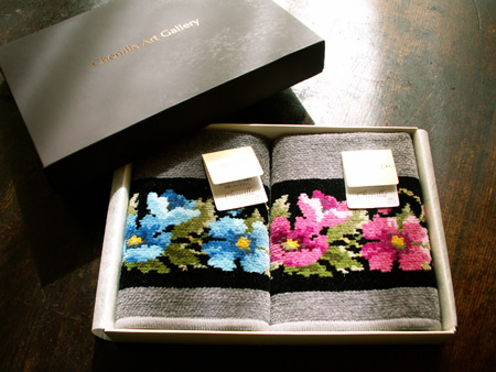 いろいろと楽しませていただいた新作発表会。そのうえ、お土産までいただいてしまいました。上等なシェニール織のタオルチーフセット。綿の密度が濃い、みっちりとした触り心地です。