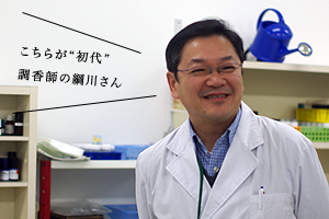 そんな老舗入浴剤メーカーの研究所とはいったいどんな所なのでしょうか!?伺ったのは「(株)バスクリン つくば研究所」。まだ出来たてホヤホヤの新研究所には、移転を祝った蘭がたくさん並んでいました。今回お話を聞かせてくださったのは、調香師でもあり医学博士でもある綱川光男さん、温浴効果の測定を担当されている鳥居和樹さん、製剤開発を担当されている杉浦満さん、香りを作る調香師の荘司博行さん。みなさんユーモアたっぷりのお話上手で、始終笑いが絶えない取材となりました。