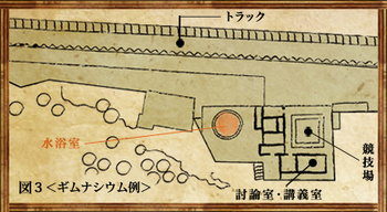 もうひとつは、「ギムナシウム」と呼ばれる施設内の水浴室。ギムナシウムは、古代ギリシャ特有の“健全な精神は健全な肉体に宿る”という思想に則った施設で、<図3>のように、体育のための競技場と、教育のための講義室が一緒になった複合施設。