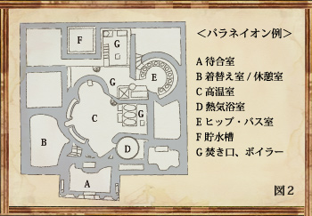 <図2>のバラネイオンは紀元前三世紀のものだが、ボイラーによる熱気浴や高温室はもちろん、熱気を床下に送り込む「床暖房」も備わっていたというから驚くばかり。