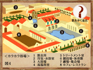 ”テルマエ”は時代を経るごとに巨大化し、設備もどんどん充実していく。三世紀に入って作られた「カラカラ大浴場」<図4>は、一度に1,600人もの人が入浴できたという。呆れるほどの広さ!風呂の他、競技場、劇場、図書館、集会所が併設され、周囲にはカフェやレストランが立ち並んでいたという。もはや風呂と言うよりレジャーランド……。