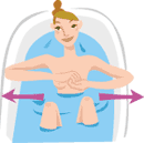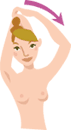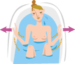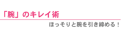 このマッサージはバスタブにつかりながらでもできるので、バスルームで行うのもオススメ。マッサージのポイントは下から上へ引き上げること。また、ぜい肉をつまみだす心持ちで行うこと!各マッサージ2分間が目安です。 マッサージ わきの下から二の腕にかけてを、指の腹の部分で押していきます。