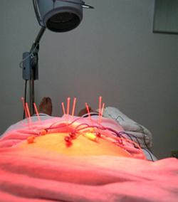 さて、実際の施術は、写真のように、お腹を中心に鍼を刺していきます。他にも、足、頭、腕にも少々。鍼は初体験。やっぱり、チクリと痛い場所もありますね。