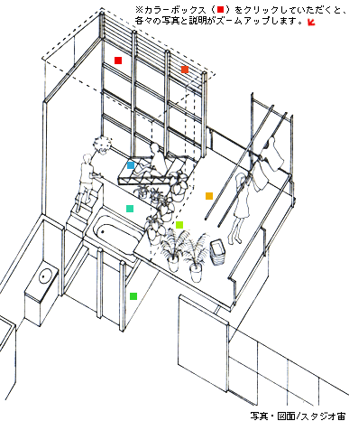 デッキテラス。洗濯物は浴室の階段を上ってここに干す。2階の寝室からも出入りできる。